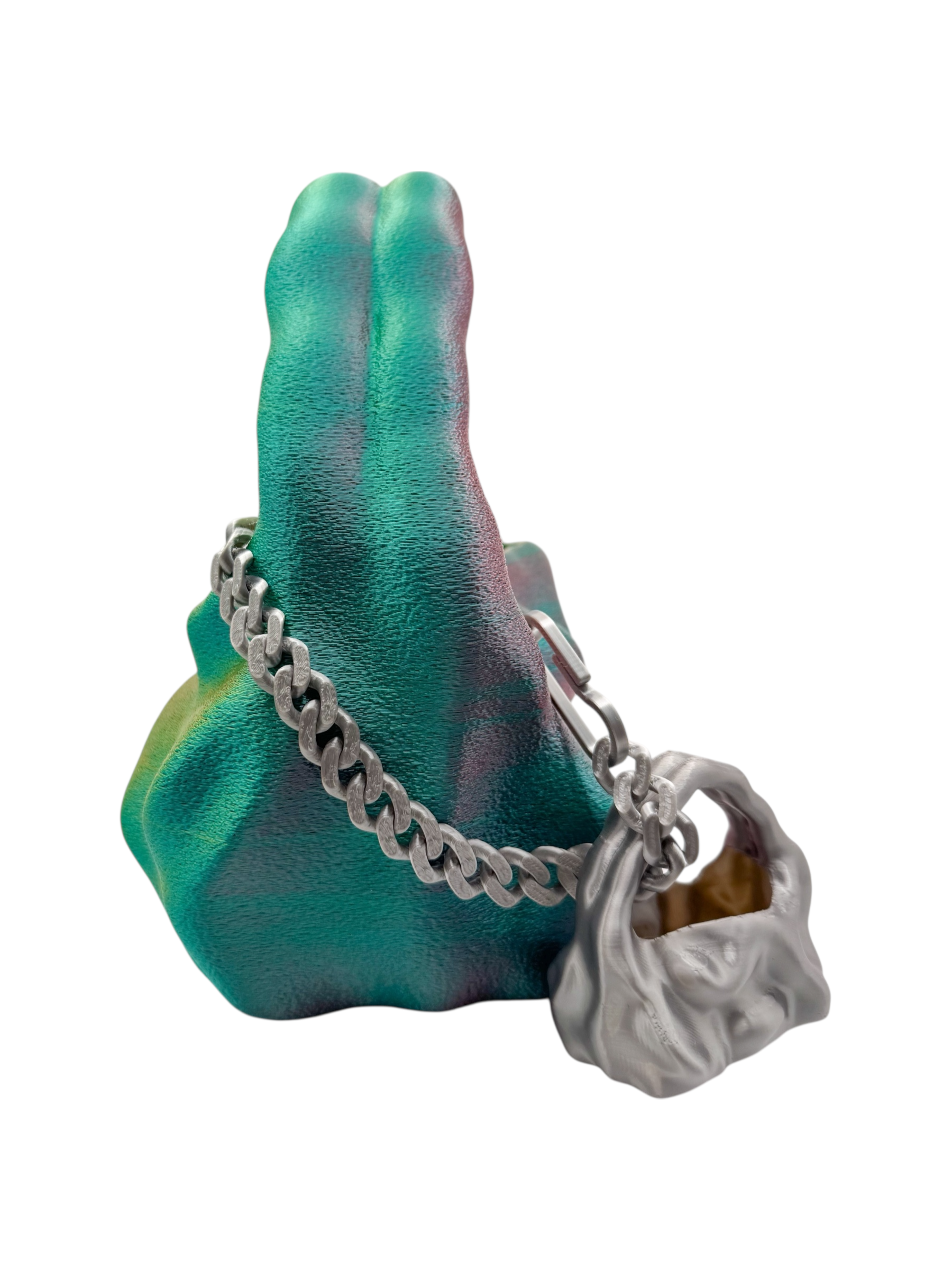20 horas de arte, impreso en 3D por más de 20 horas con PLA biodegradable, derivado del maiz, cada curva de este bolso refleja el diseño the cosmic water de not too fancy.