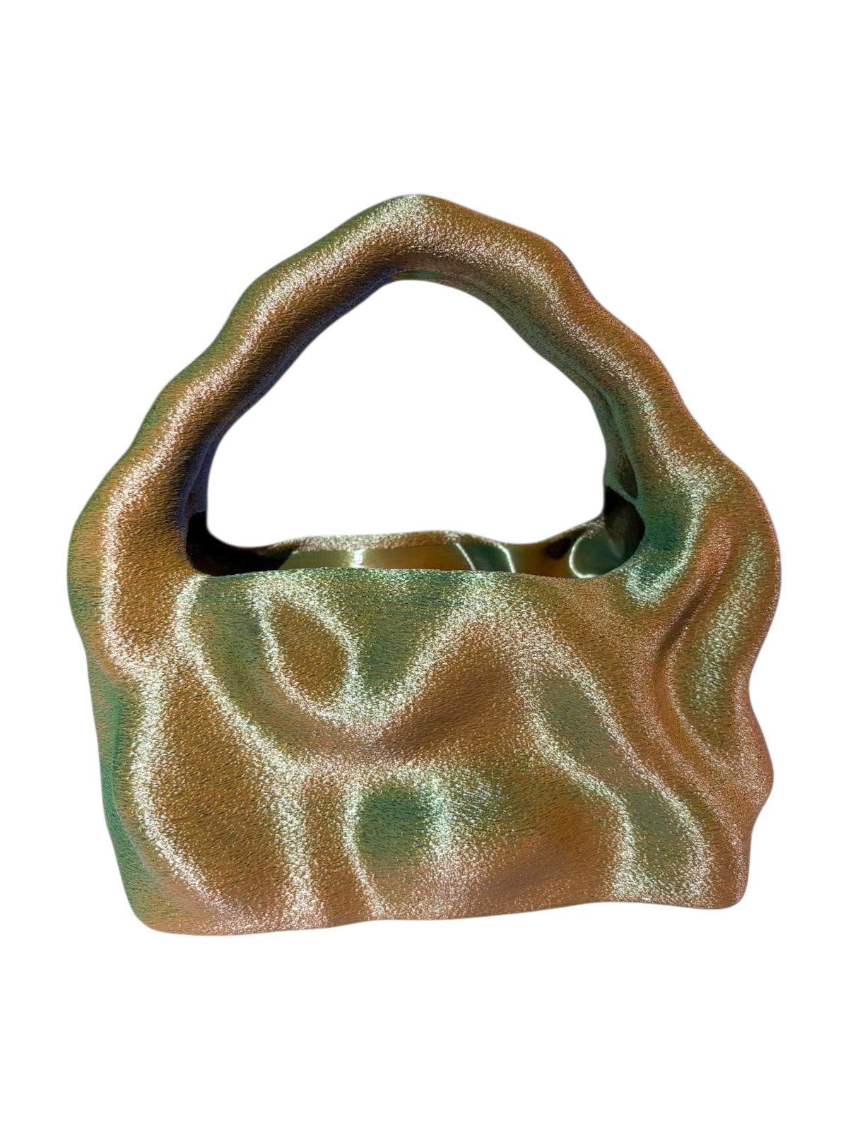 20 horas de arte, impreso en 3D por más de 20 horas con PLA biodegradable, derivado del maiz, cada curva de este bolso refleja el diseño the cosmic water de not too fancy.