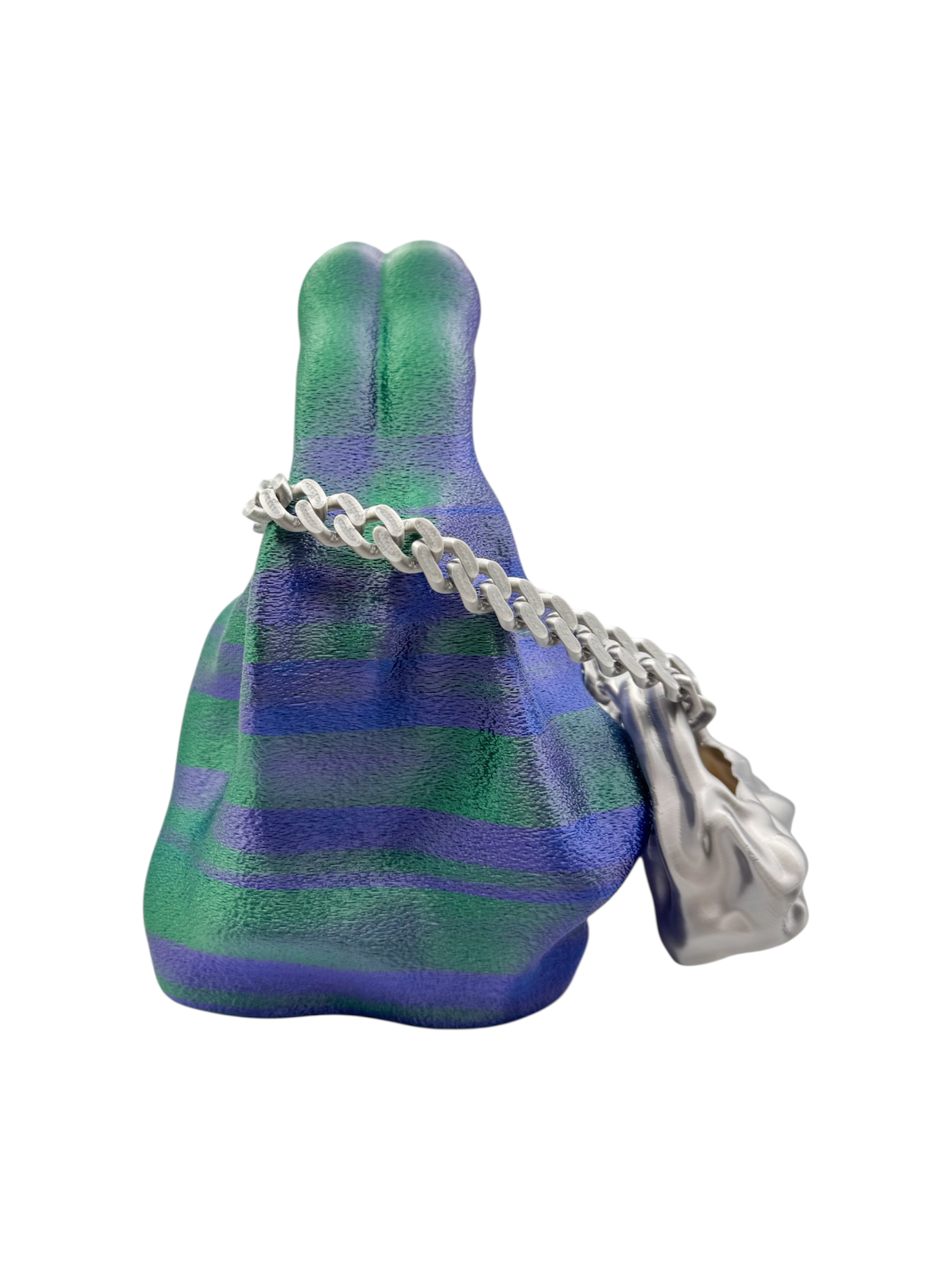 20 horas de arte, impreso en 3D por más de 20 horas con PLA biodegradable, derivado del maiz, cada curva de este bolso refleja el diseño the cosmic water de not too fancy.