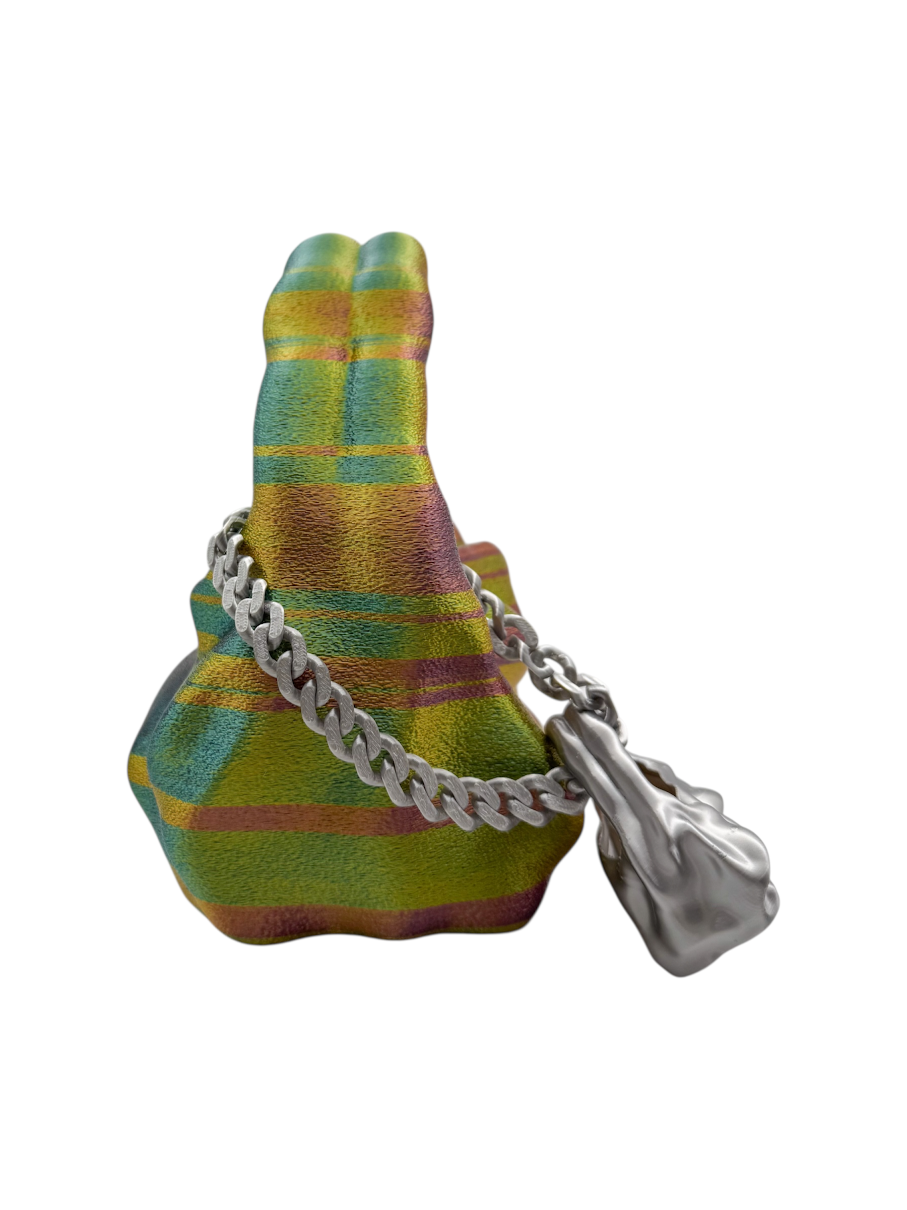 20 horas de arte, impreso en 3D por más de 20 horas con PLA biodegradable, derivado del maiz, cada curva de este bolso refleja el diseño the cosmic water de not too fancy.