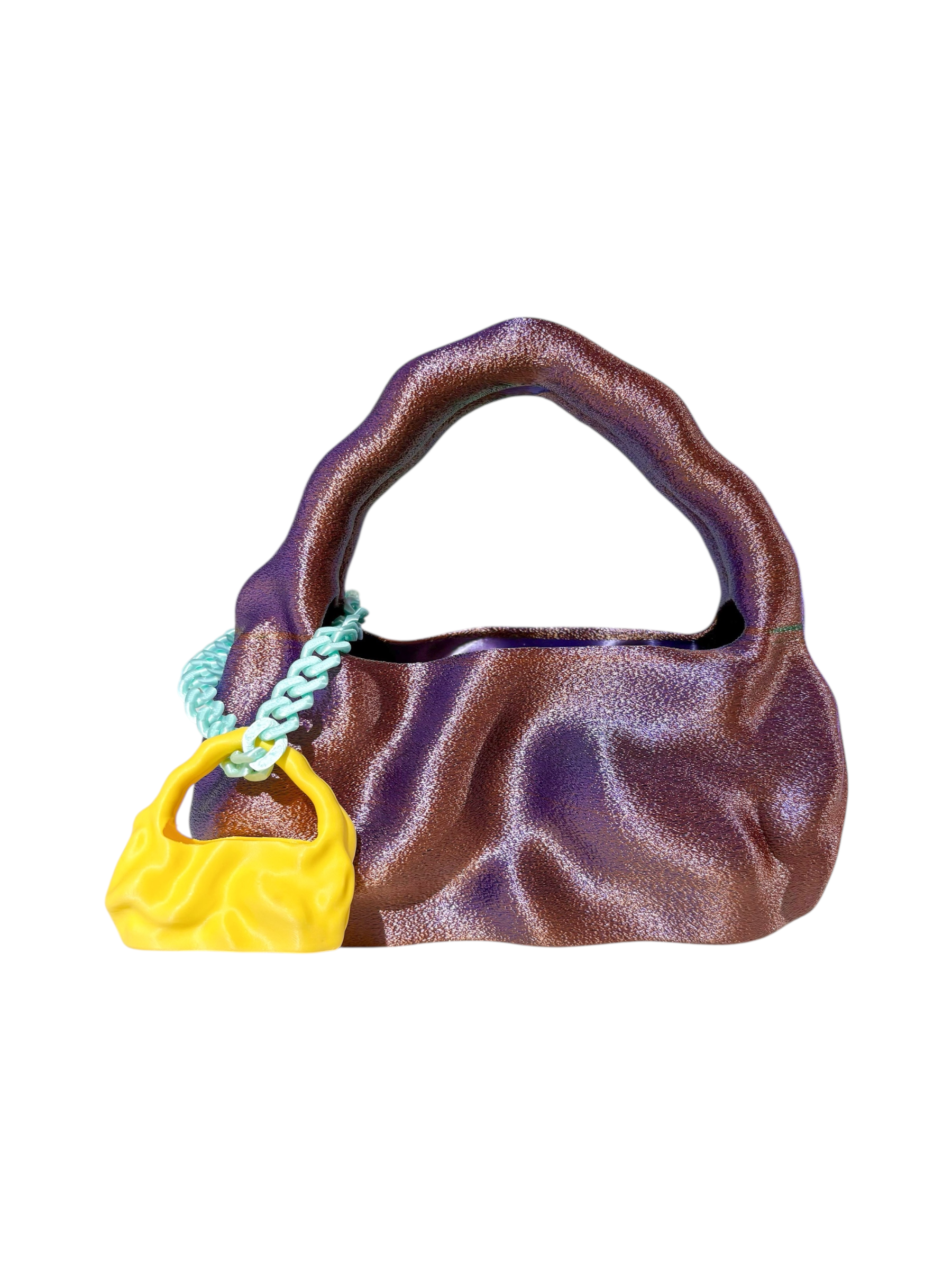 20 horas de arte, impreso en 3D por más de 20 horas con PLA biodegradable, derivado del maiz, cada curva de este bolso refleja el diseño the cosmic water de not too fancy.