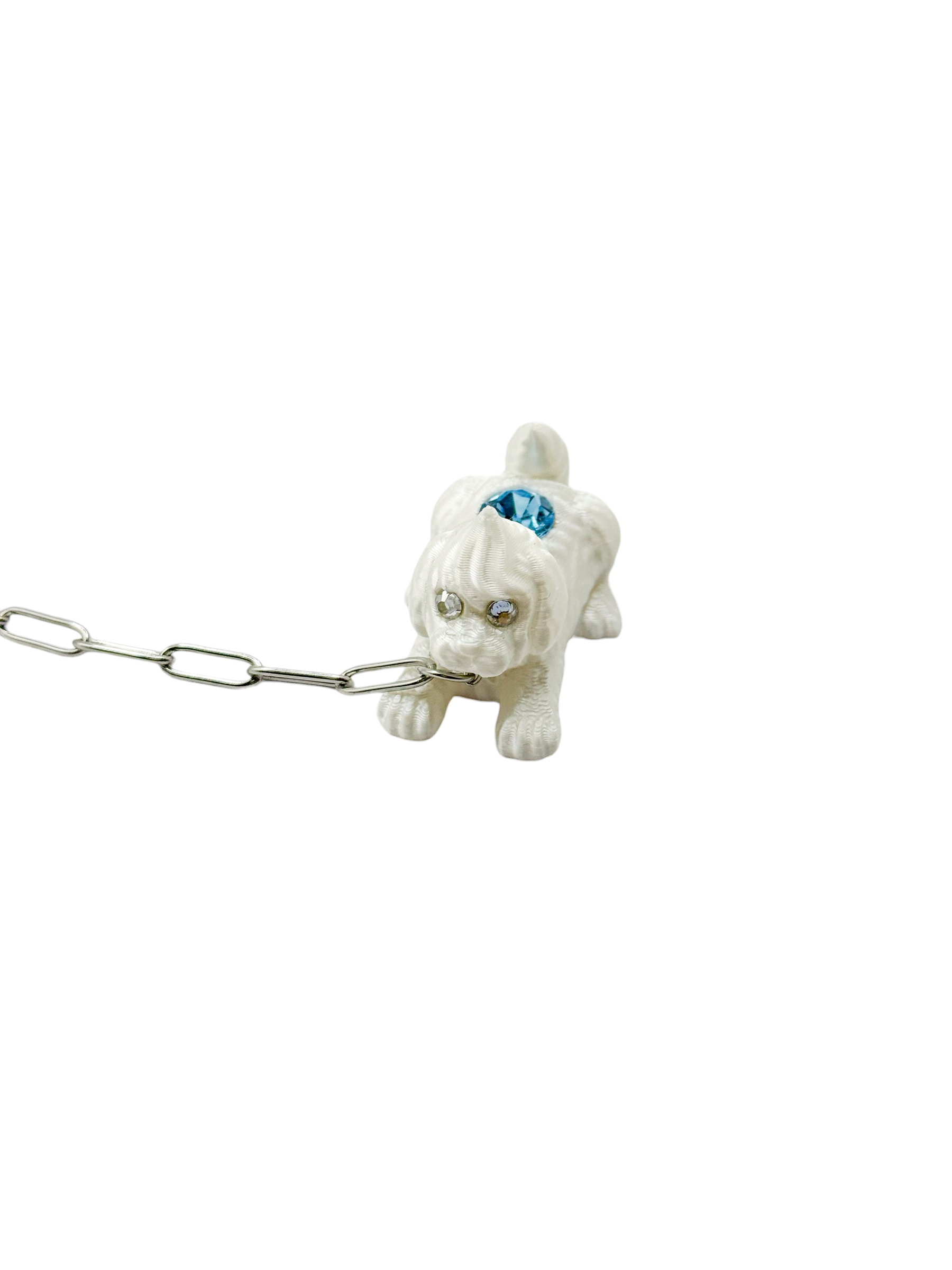 El perro es de crema y cristales preciosos, la cadena es de acero inoxidable e impresión 3D en PLA, un material biodegradable. Adentro tiene un chip NFC que abre lo que tú quieras mostrarle a quien lo lleva: una dedicación, un link a tu Insta, tu canción favorita, una playlist de Spotify, un video de YouTube, la identificación de tu mascota, lo que sea, ¡tú decides!.