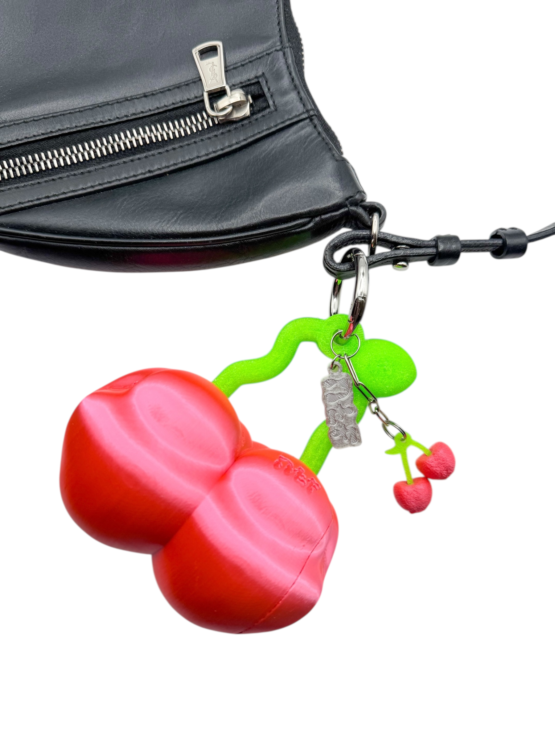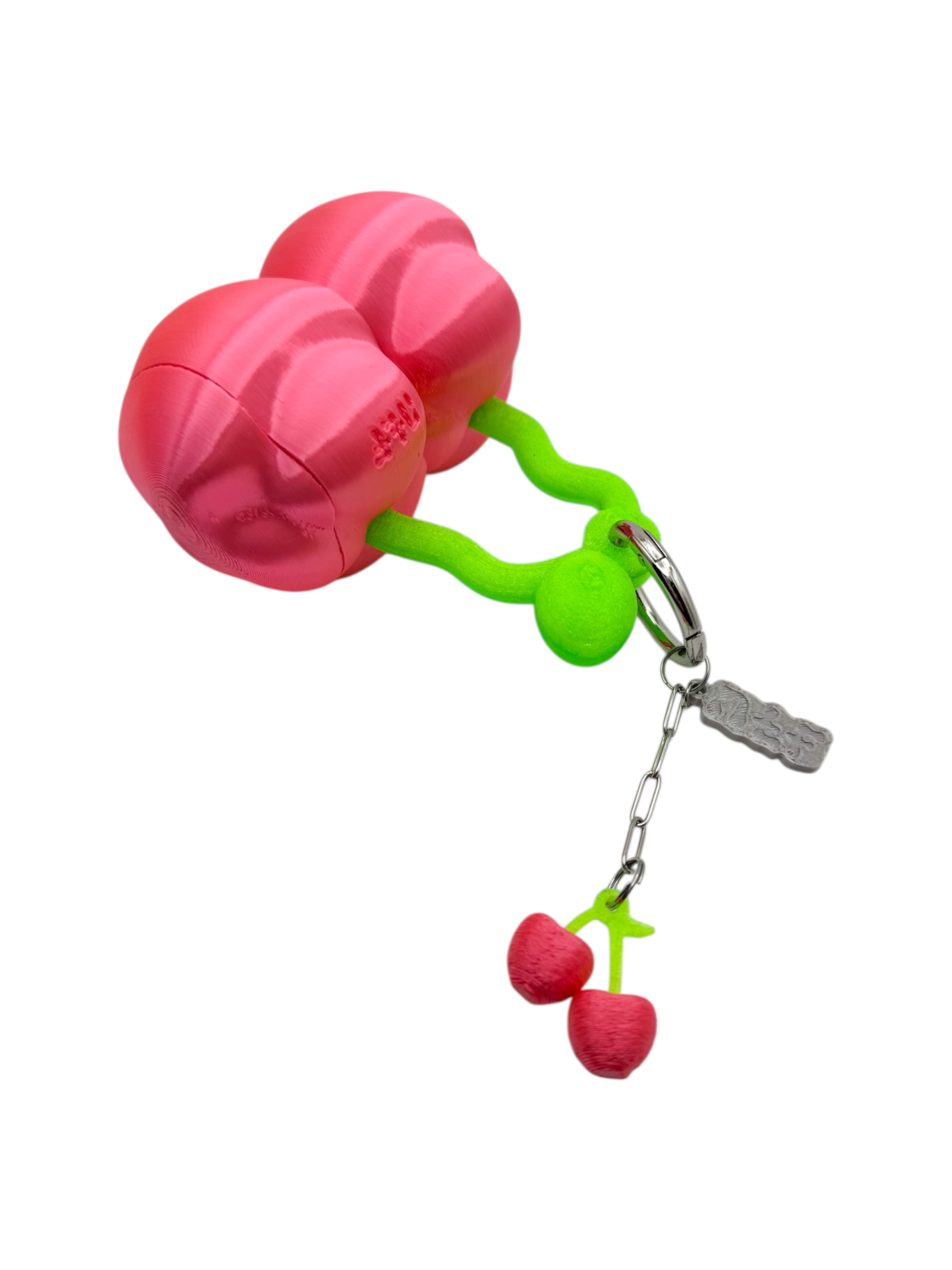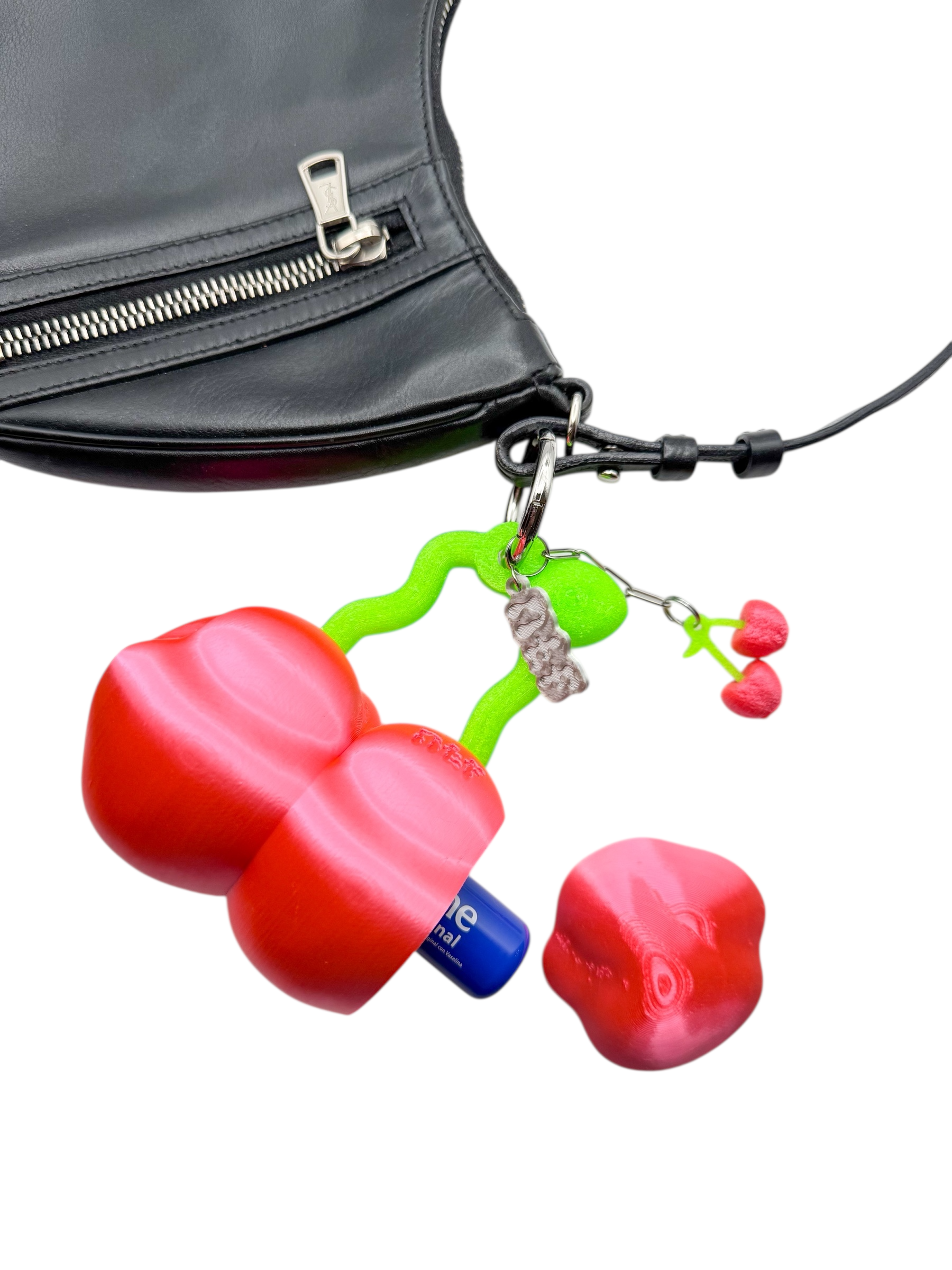 Un charm case de cerezas para tu lipstick, inspirado en las formas orgánicas, irregulares y en constante movimiento de not too fancy, impreso en 3D, con PLA, un bioplástico eco-friendly, derivado del maíz, biodegradable en composta industrial, que marca tu estilo.