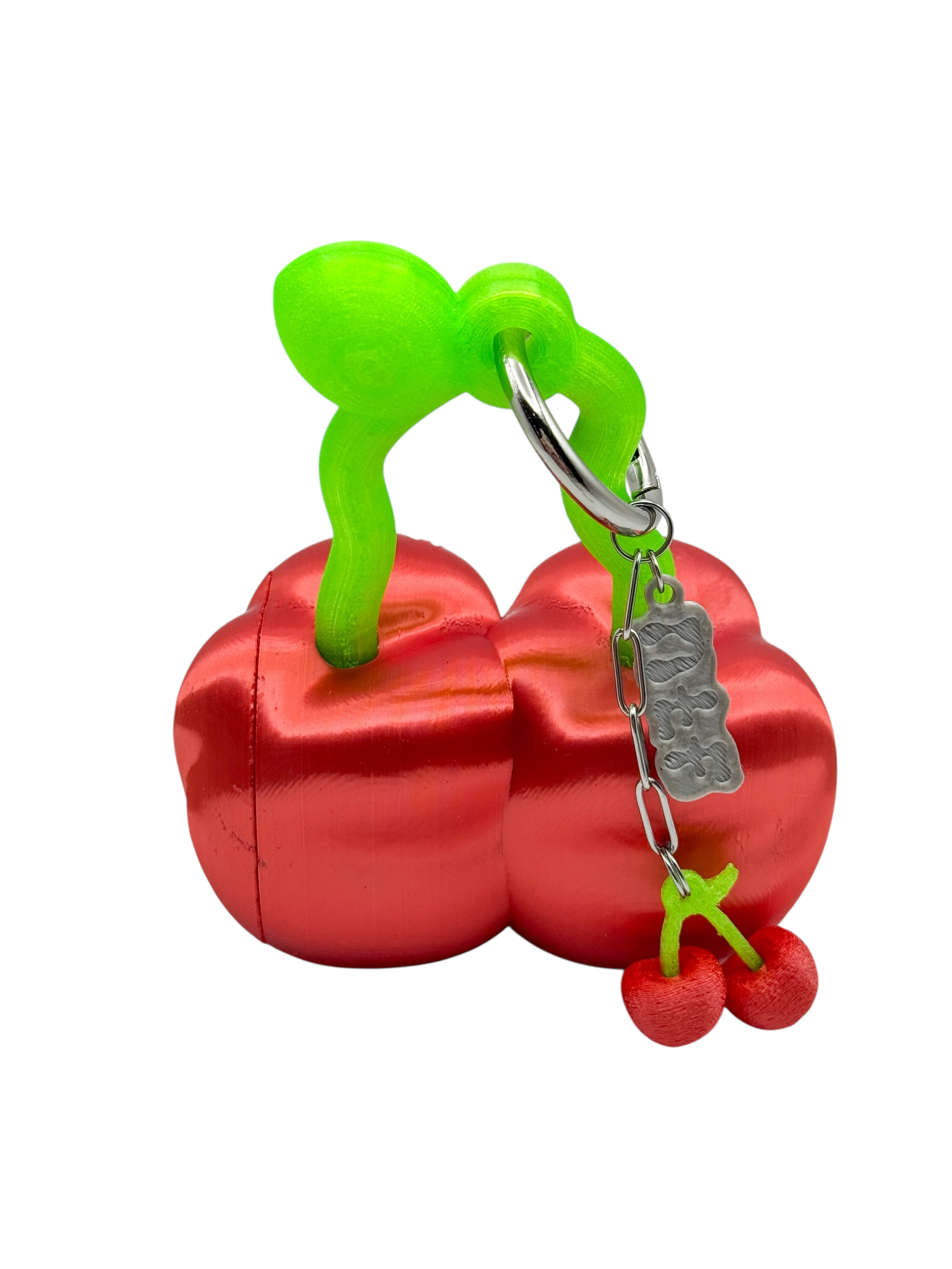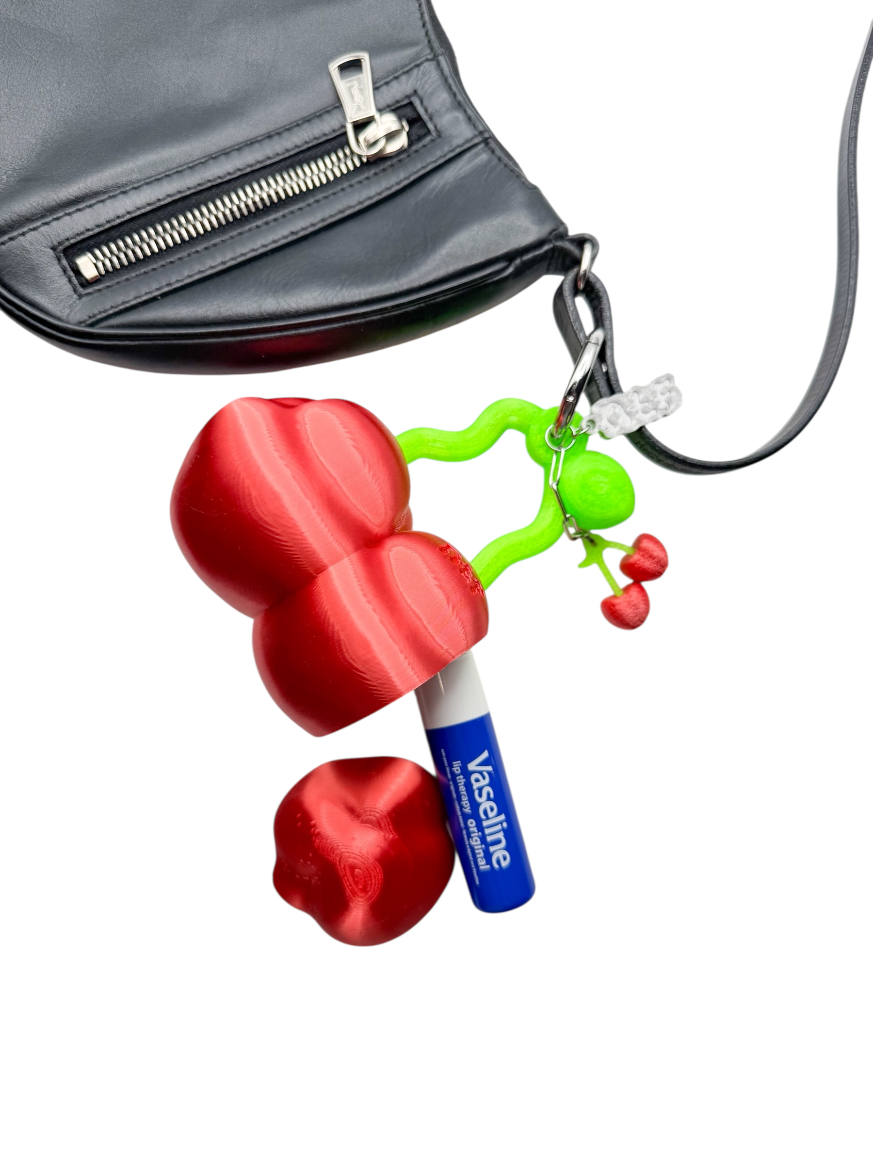 Un charm case de cerezas para tu lipstick, inspirado en las formas orgánicas, irregulares y en constante movimiento de not too fancy, impreso en 3D, con PLA, un bioplástico eco-friendly, derivado del maíz, biodegradable en composta industrial, que marca tu estilo.
