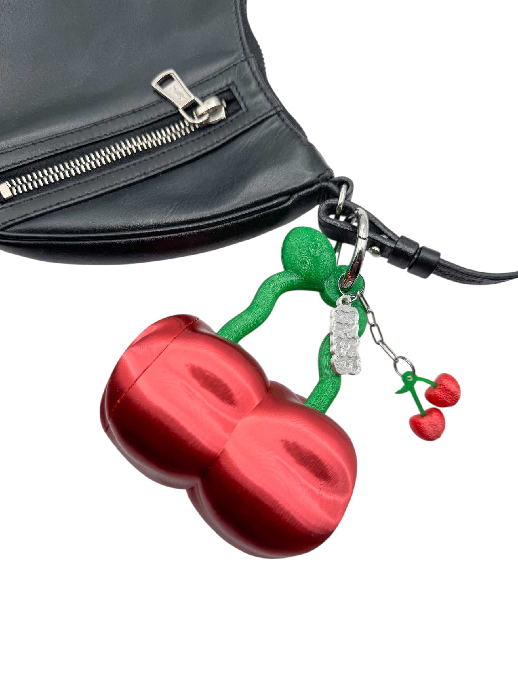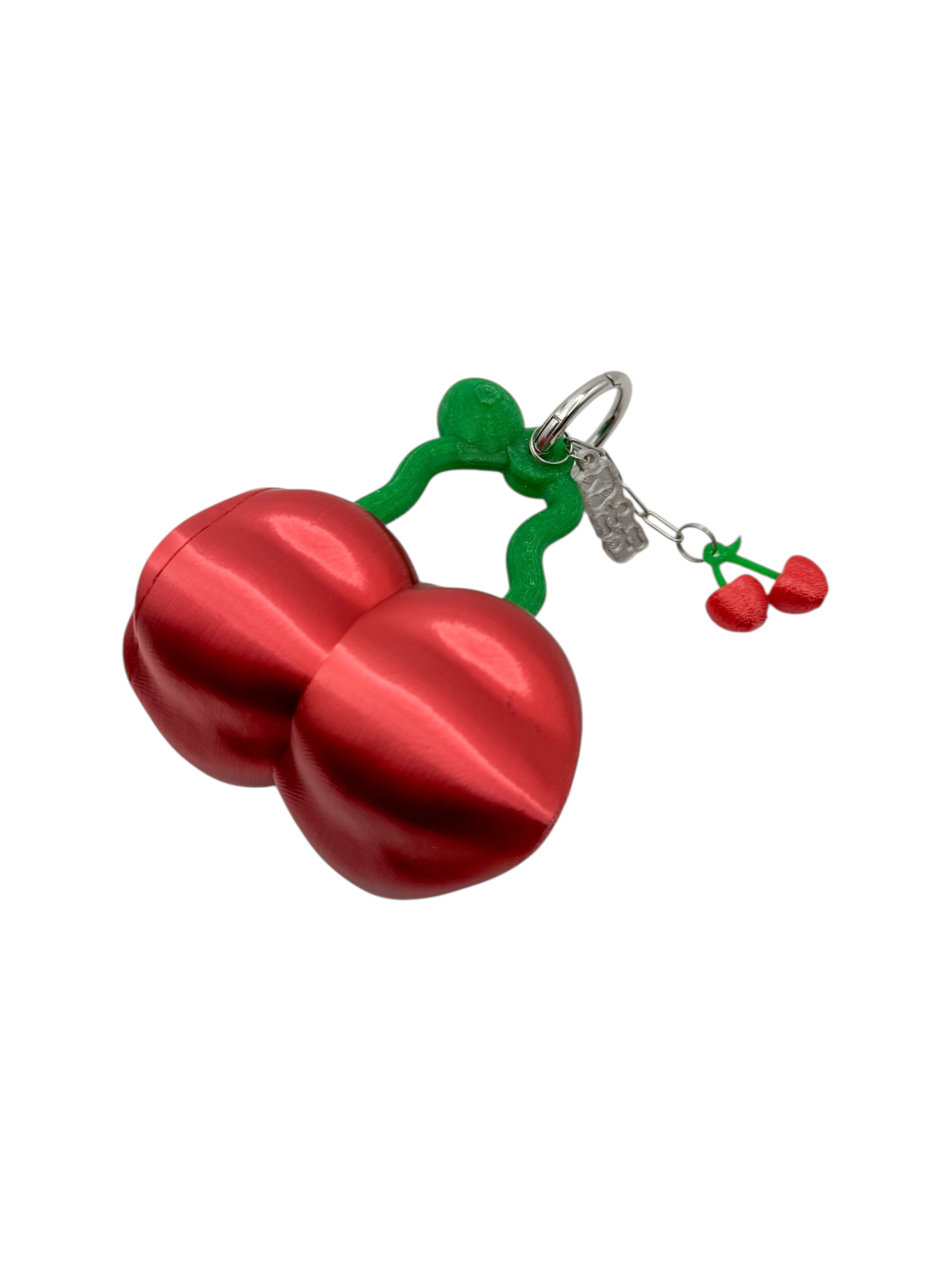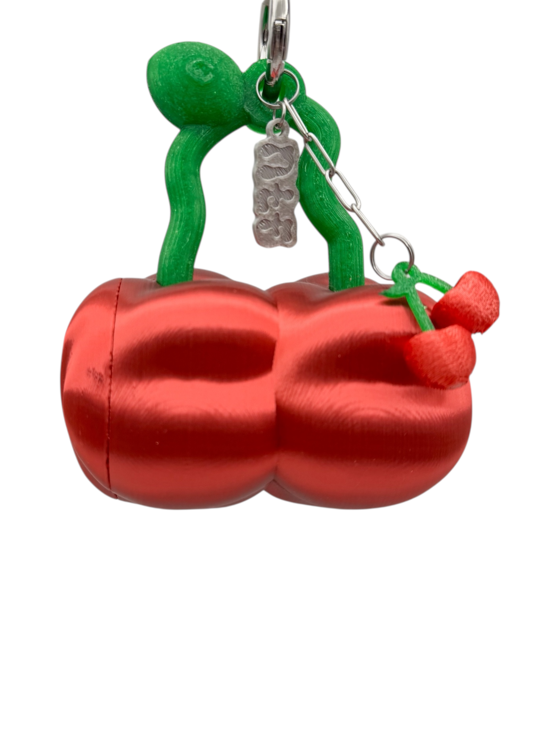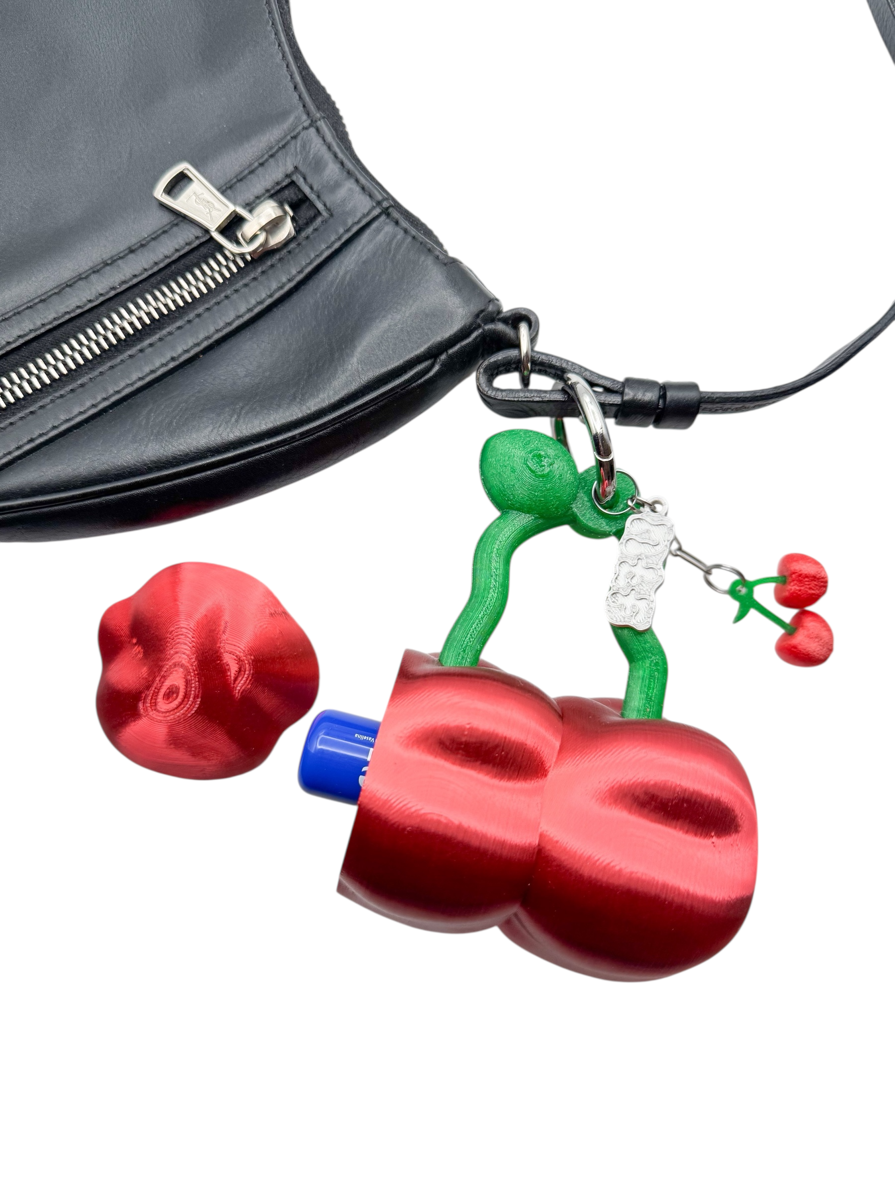 Un charm case de cerezas para tu lipstick, inspirado en las formas orgánicas, irregulares y en constante movimiento de not too fancy, impreso en 3D, con PLA, un bioplástico eco-friendly, derivado del maíz, biodegradable en composta industrial, que marca tu estilo.