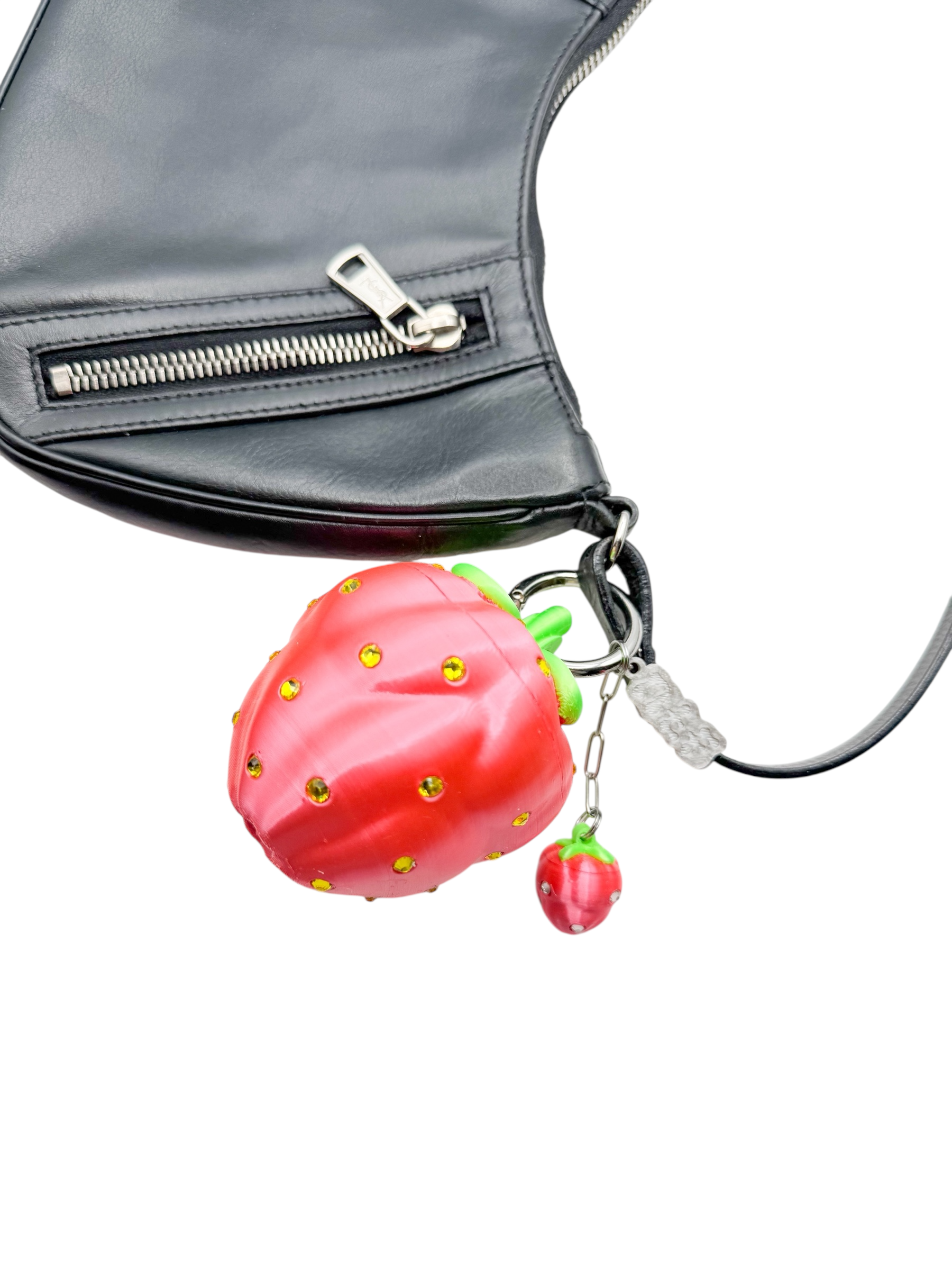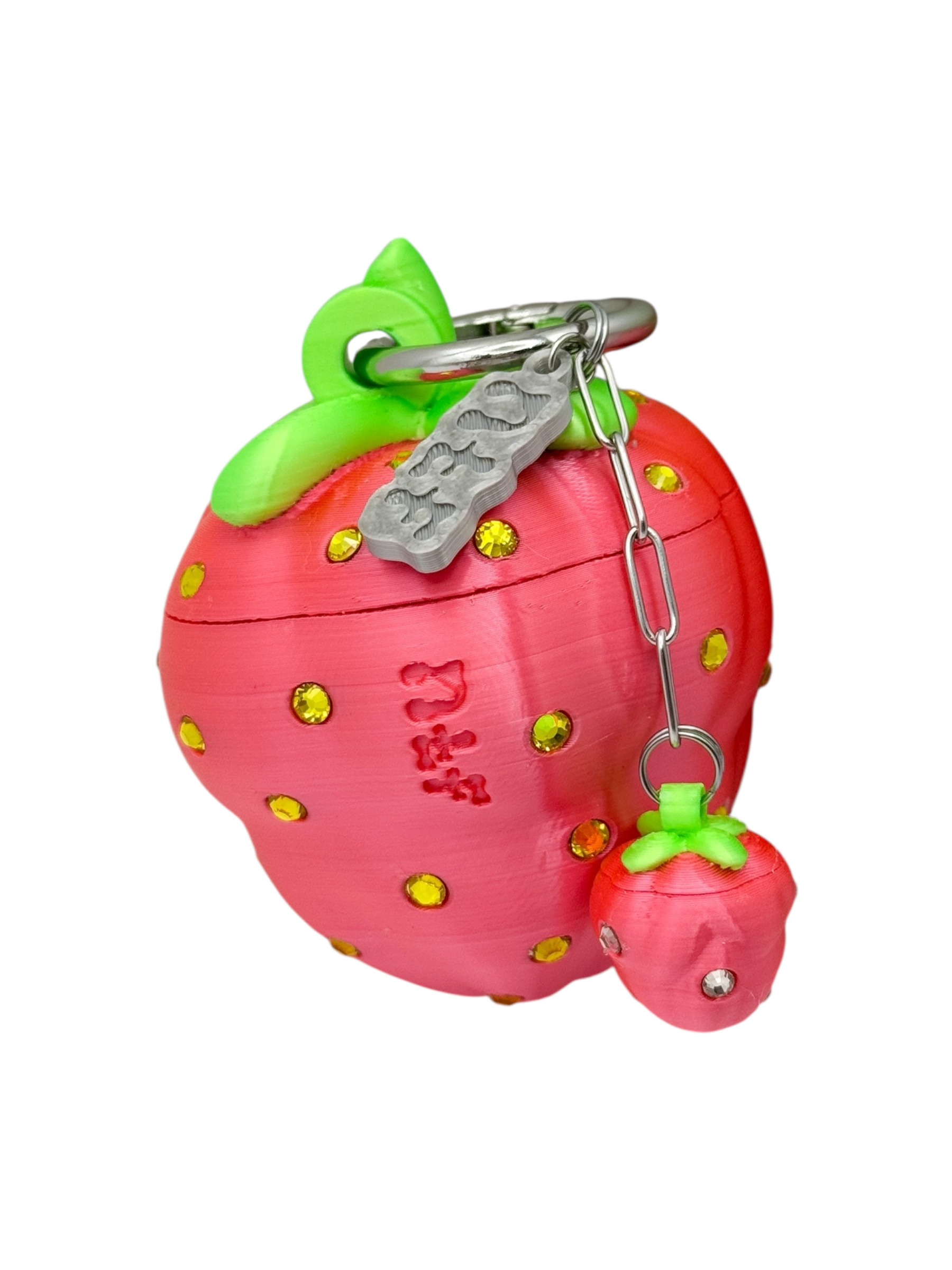 Un charm case de fresa con cristales preciosos para tu vaselina o lo que quieras, inspirado en las formas orgánicas, irregulares y en constante movimiento de not too fancy, impreso en 3D, con PLA, un bioplástico eco-friendly, derivado del maíz, biodegradable en composta industrial, que marca tu estilo.